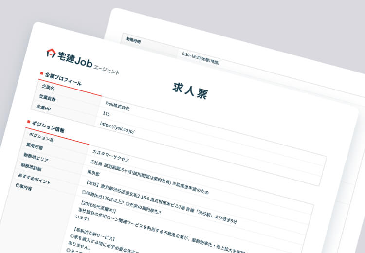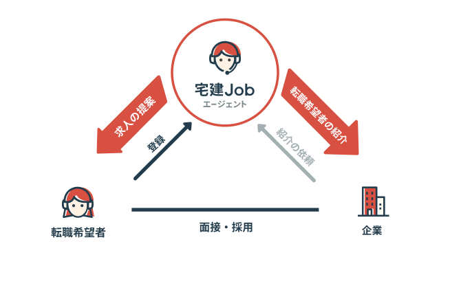 宅建Jobエージェントは、キャリアアドバイザーが「転職希望者」と「採用企業」の間に入り求人のご提案、書類添削、内定、入社後フォローまでを一貫してお手伝いさせていただく不動産業界専門の「転職支援サービス」です。